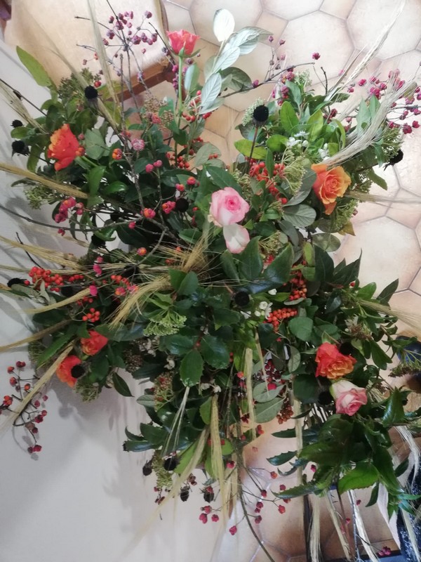 Nous réalisons une composition (bouquet, jardinières, couronnes), toujours avec des végétaux trouvés dans la nature, (branches, baies, pommes de conifères etc...) fleurs de nos jardins et matériel récupéré (coupes, vases, rubans etc...).